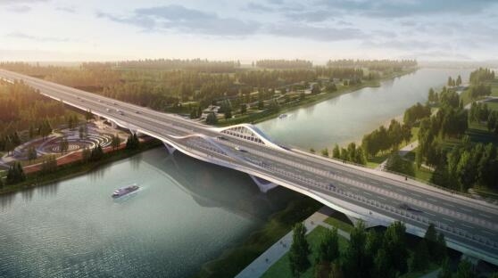 安運橋主橋設計采用梁-拱型組合體系,立意荷香,將荷葉形態融入到橋梁造型當中,荷葉浮于運河之上,整個造型宛如運河上盛開的荷花,生態自然,與環境融為一體,給人以生機盎然、自然和諧的美感。