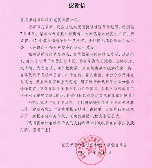 今年6月,重慶市萬(wàn)州區(qū)五橋街道、長(zhǎng)灘鎮(zhèn)等區(qū)域發(fā)生嚴(yán)重洪澇災(zāi)害,在防汛救災(zāi)的緊要關(guān)頭,市建科院公司第一時(shí)間響應(yīng)號(hào)召,緊急調(diào)派房屋鑒定專家團(tuán)隊(duì)前往災(zāi)區(qū)開(kāi)展搶險(xiǎn)排險(xiǎn)工作,晝夜奮戰(zhàn)完成了五橋街道、太白街道、周家壩街道、高筍塘街道、武陵鎮(zhèn)和長(zhǎng)灘鎮(zhèn)等主要受災(zāi)區(qū)域共計(jì)440棟房屋的災(zāi)后隱患排查工作,充分展現(xiàn)了國(guó)企責(zé)任擔(dān)當(dāng),獲重慶市萬(wàn)州區(qū)住房和城鄉(xiāng)建設(shè)委員會(huì)感謝信。