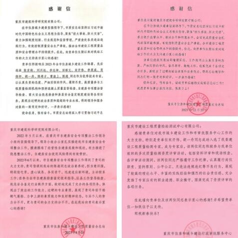 2023年,重慶設(shè)計(jì)集團(tuán)市建科院公司全面貫徹落實(shí)黨的二十大精神,緊緊圍繞市委市政府戰(zhàn)略部署,在全面服務(wù)重慶城市建設(shè)發(fā)展中奮楫爭(zhēng)先、勇挑重?fù)?dān),先后收到重慶市住房和城鄉(xiāng)建設(shè)工程質(zhì)量安全總站、重慶市住房和城鄉(xiāng)建設(shè)行政審批服務(wù)中心、重慶市萬(wàn)州區(qū)住房和城鄉(xiāng)建設(shè)委員會(huì)等十余個(gè)單位的數(shù)封感謝信、表?yè)P(yáng)信,信中充分肯定了市建科院公司2023年在重大工程建設(shè)、應(yīng)急搶險(xiǎn)等方面所做的貢獻(xiàn),并表達(dá)了誠(chéng)摯的感謝。