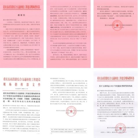 2023年12月至2024年1月,市建科院公司收到來(lái)自重慶東站鐵路綜合交通樞紐工程現(xiàn)場(chǎng)建設(shè)指揮部的3封感謝表?yè)P(yáng)信,對(duì)市建科院公司積極履行監(jiān)理單位職責(zé)、主動(dòng)派員參與支援重慶東站建設(shè)、高效推進(jìn)完成各關(guān)鍵性節(jié)點(diǎn)表示感謝,對(duì)我司李宗民、王波同志給予表?yè)P(yáng)。
