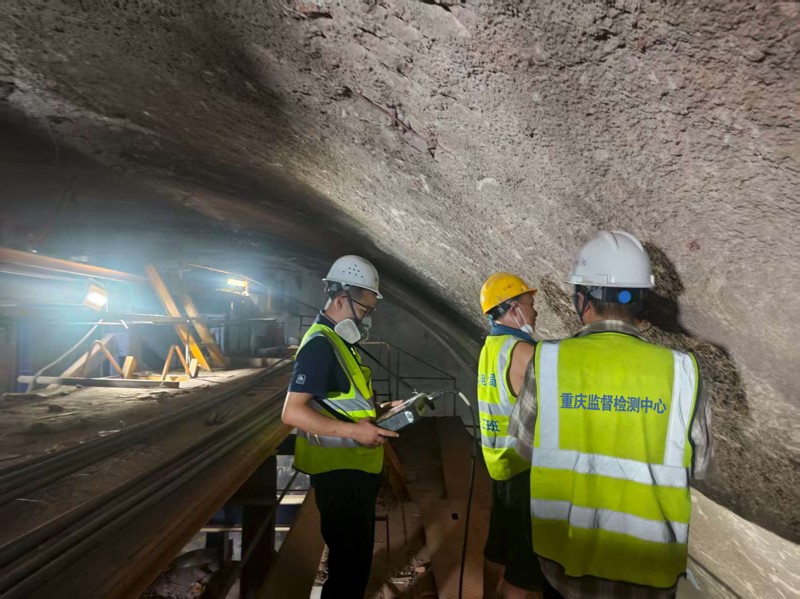 監督檢測中心 主要承擔軌道交通27號線璧山站至磁器口站區段的工程質量檢測任務,其中對中梁山隧道區間的檢測涵蓋多項關鍵內容:包括建筑材料、錨桿拉拔力、襯砌厚度、襯砌及背后密實狀況、錨桿錨固密實度、襯砌混凝土強度及保護層厚度等檢測。為確保項目如期貫通,市建科院統籌調配人員、設備資源,組建專業技術團隊,制定周密檢測方案。工作聚焦隧道襯砌結構質量檢測的核心環節,高效推進各項檢測任務,以及時響應、精準可靠的數據,為施工質量筑牢保障防線。
